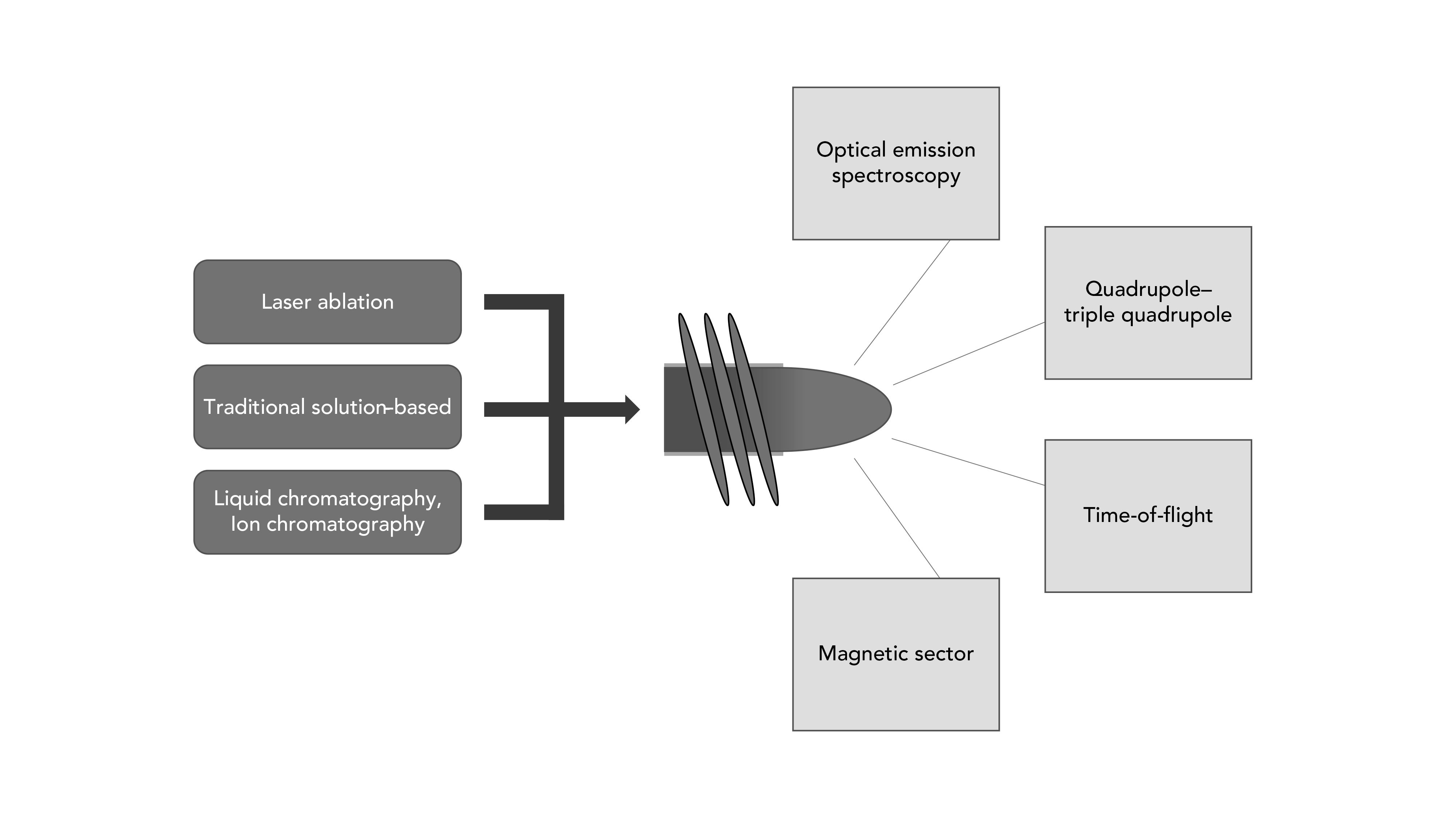 Figure 1: Common sample introduction techniques and detection op- tions for the inductively coupled plasma (ICP) excitation–ionization source.
