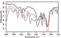 Many of the new peaks that emerge are present in all three samples. Only a few bands, in the 1600 cm-1 to 900 cm-1 region, as shown in Figure 2, are unique to any given sample. This is in good accordance with listed ingredients which indicates only a few unique substances in the analytes. Unique peaks include a H–C–H alkane bend at 1500 cm-1 , probably from tocopheryl acetate, an ingredient found only in the "nourishing" formula. Characteristic peaks are also observed at 1225 cm-1 and 985 cm-1 which are likely due to panthenol, another element particular to the nourishing formulation. Some other ingredients specific to one formula, such as citric acid (nourishing) and benzophenone-1 (strengthening) are present in quantities too small to be detected. Use of additional reflections or greater concentration of the sample might make these apparent.