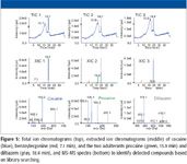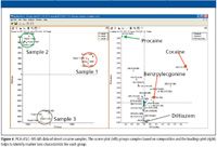 The scores plot clearly groups analyzed samples and the loadings plot helps to find characteristic marker ions. Automatically acquired MS-MS spectra were searched against a mass spectral library to identify the adulterants, the anesthetic procaine and vasodilator diltiazem, present in the cocaine samples (Figure 5). Information on cocaine adulteration and concentration is useful for crime scene investigation and to study illegal drug trade.