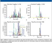 A number of pesticides were quantified using the selective and sensitive MRM and identified based upon their MRM ratio. Example results of the analysis of a paprika powder are presented in Figure 1 and Table I.