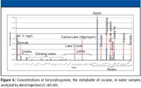 The selective and sensitive MRM method was used to quantify and identify 80 PPCP in water samples. The targeted list contained pharmaceuticals, pesticides, and drugs of abuse, including important metabolites based upon method EPA 1694 and other chemicals of high concern. Figure 6 shows the quantitative results of benzoylecgonine, a metabolite of cocaine, in the studied water samples. As expected, benzoylecgonine was found in rivers running through major cities at concentrations of up to 200 ng/L, indicating the abuse of cocaine. The concentration of benzoylecgonine in water samples collected in less urban and wilderness areas was much lower with the exception of one creek and one lake in popular vacation destinations. The concentration of benzoylecgonine reflects the amount collectively excreted in urine and can be used to estimate drug consumption. Also, when analyzed over time, consumption habits can be investigated (2).