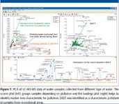 PCA was again used to study nontargeted compounds in the collected water samples (Figure 7). The scores plot clearly differentiates samples originating from different water types. River samples arrange depending upon urbanity. One drinking water sample was collected during flood season. The position of this sample in the scores plot indicates higher pollution of the drinking water produced from river bank filtrate.