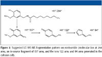 In parallel, the extracts were analyzed using the GUS method. Many hundreds of mass-retention time pairs were found in all sample extracts using the nontargeted peak-finding algorithm of Cliquid software (AB SCIEX). The EMS scan was used to find mass molecular ions of interest, and the automatically acquired EPI scans were used to identify detected compounds by library searching. Figure 2 shows an example of the detection and identification of carbendazim, which already was quantified during the MTS method. In addition, the GUS method found nontargeted ions such as mass 137 amu at 5.5 min. The signal was identified as nonivamide through MS-MS library searching. Nonivamide (pelargonic acid vanillylamide PAVA) is a capsaicinoid present in chili peppers but also manufactured synthetically. (The 137 ion is an in-source fragment of nonivamide, Figure 3.) The molecular ion of nonivamide 294 amu also was detected at the same retention time but with low sensitivity.
