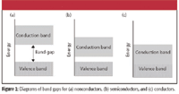 Another way to describe conductors and nonconductors is in terms of band gap. Imagine that all of the electrons in a solid have a particular range of energies. This range of energies is called the valence band. Now imagine that an electron has to be promoted to a higher range of energies to be free enough to conduct electricity. This higher range of energies is called the conduction band. The energy difference between the valence band and the conduction band is called the band gap. Insulators have a relatively high band gap (Figure 2a), on the order of 300 kJ/mol. Semiconductors have a small band gap (Figure 2b), so that either temperature can excite electrons thermally or the presence of dopants can provide excess electrons or holes that would have an energy in the conduction band. In conductors (Figure 2c), the band gap is zero and the two bands overlap.