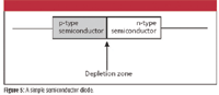 Diodes also can be made from semiconductors. Figure 5 is a diagram of a simple semiconductor diode. It is essentially two pieces of semiconductor, one p-type and one n-type, in contact. The very thin region about the contact surface is called the depletion zone. In this zone, the electron-deficient matter in the p-type semiconductor and the electron-rich matter in the n-type semiconductor essentially cancel each other out, so the depletion zone is relatively nonconducting.