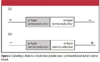 How does this diode work? Consider the two ways in which a semiconductor diode can be connected to a source of electricity. In one case, the positive end of a circuit can be connected to the p-type semiconductor and the negative end of the circuit can be connected to the n-type semiconductor. This type of connection is called forward-biased and is shown in Figure 6a. This type of connection essentially increases the number of electrons in the n-type semiconductor and decreases the number of electrons in the p-type semiconductor — that is, it increases the number of holes in the p-type semiconductor. The net effect is to reduce the width of the depletion zone. Eventually, the depletion zone gets so narrow that electrons can jump across the barrier, and current flows. Usually, some minimum voltage is needed to narrow the zone enough so that current flows; for silicon diodes, this minimum voltage is about 0.6–0.7 V.