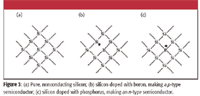 Suppose an element such as phosphorus were added to pure silicon as a dopant. Neutral phosphorus typically likes to make five bonds, but in a normal silicon lattice there are only four next-nearest neighbors with which to make covalent bonds. One of the valence electrons in the phosphorus atom is unbonded, as shown in Figure 3c. Because of the presence of the extra unbonded electron, the conductivity of this doped silicon is also higher than that of pure silicon, and it too is a semiconductor. This type of doped silicon is called an n-type semiconductor.