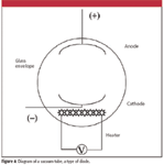 A diode is an electronic component that allows current to travel in one direction but not in the other direction. The earliest diodes were known colloquially as vacuum tubes. Figure 4 shows a diagram of a vacuum tube. It is essentially a glass envelope with a vacuum inside (residual pressure of about 10–10 –10–13 atm) and several pieces of metal strips or wires called electrodes. The cathode is negatively charged and near a heater. The heater warms up the cathode, and when hot, the cathode thermally emits electrons (a process called thermionic emission). The other electrode, the positively charged anode, attracts the emitted electrons, and current flows from cathode to anode. If the current polarities were switched, however, electrons (that is, current) would not flow because the anode does not have a heater nearby to cause thermionic emission. Thus, in a vacuum tube, electric current flows in only one direction. A vacuum tube also takes time to operate, because the heater has to warm up the cathode before electron emission occurs. This is why older electronics based upon vacuum tubes had a lag time before operating properly.