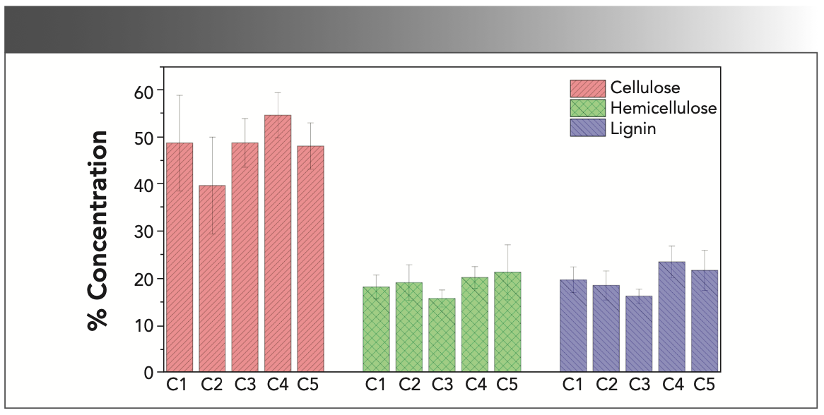 The Van Soest method was referenced (20) to determine the hemicellulose, cellulose, and lignin concentrations of the samples. During the determination, the 0.5 g powder went through four main steps. Namely, neutral detergent washing (faint boiling, 1 h), acid detergent washing (faint boiling, 1 h), 72% sulfuric acid washing (20 °C, 3 h), and burning in a muffle furnace (600 °C, 2.5 h) in turn. The neutral detergent washing removed the protein, fat, starch, and soluble sugar from the powder. The acid detergent washing aimed to dissolve the hemicellulose from the residues after neutral detergent washing. The 72% sulfuric acid washing was done to dissolve the cellulose from the residues after acid detergent washing. At this point, only lignin and silicate were left. Hence, the fourth step is to separate the silicate from the residues after the previous step by heating them. Eventually, the concentrations of hemicellulose, cellulose, and lignin were calculated according to the mass loss of steps 2 to 4, comparing to that of their previous actions. To ensure the accuracy of the determination results, all the reagents used for the chemical measurement were analytical reagent grade at a minimum.