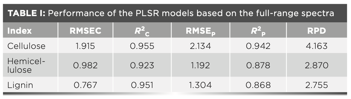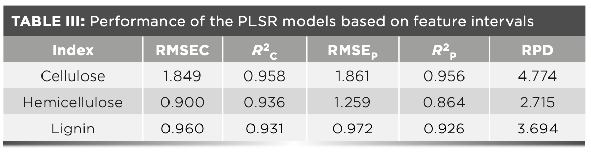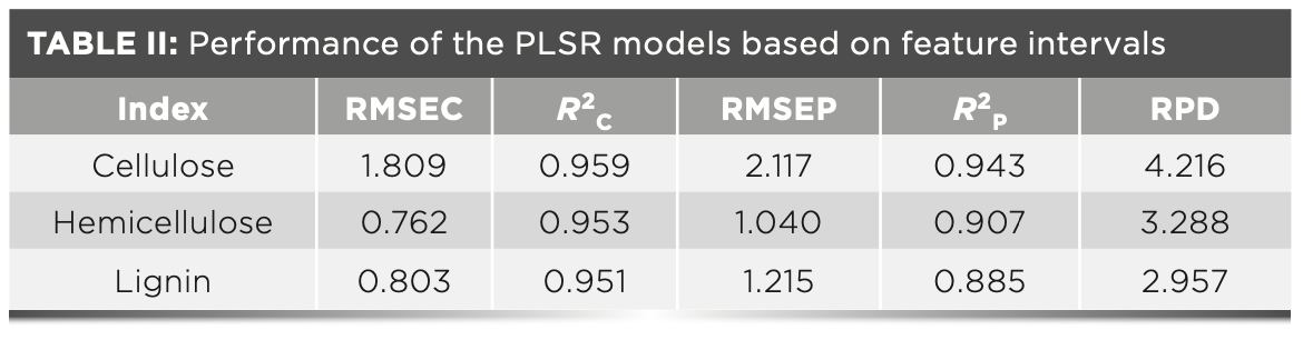 The PLSR models’ performance based on the feature intervals (Table II) is slightly better than that based on full-range spectra (Table I). The R2P and R2C values of cellulose, hemicellulose, and lignin are all greater than or equal those in Table I. Hence, the feature intervals selection makes a contribution to reduce the redundant information and improve the model performance.