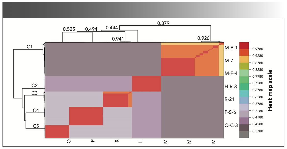If the confidence level was set to 0.525, all the samples would be clustered into five categories, namely the “OC3” samples were subdivided into “C4” and “C5.”