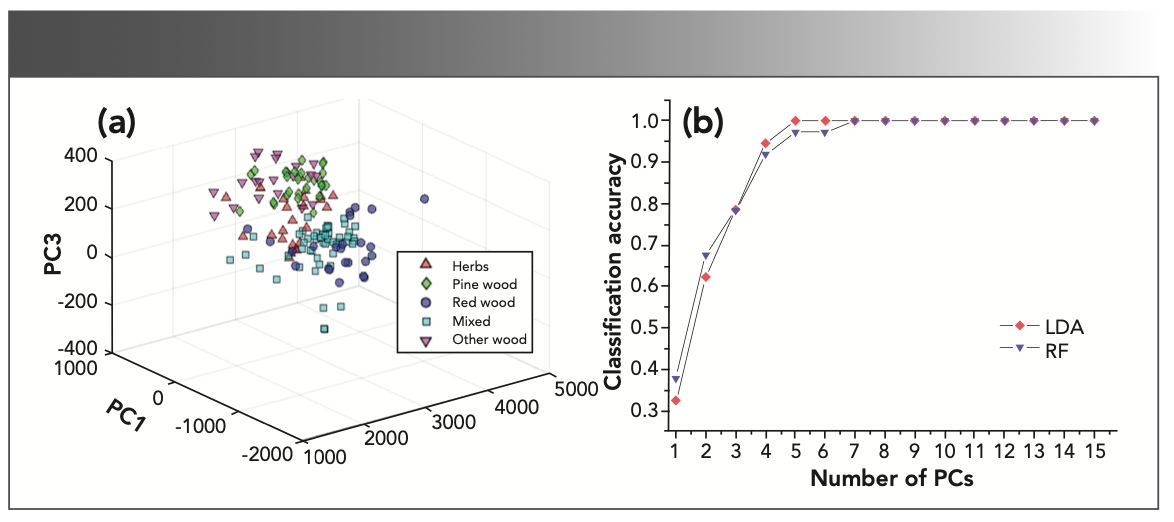 In view of that, the first three PCs don’t exhibit a remarkable ability for the biofuel pellet classification; as a result, more PCs were employed as the input variables to build LDA and RF classifiers. Through validation, it can be found that the classification accuracy of LDA classifier reached 100% when the number of PCs was equal to or greater than four, and the same excellent accuracy of RF was obtained when the number of PCs reached or exceeded eight. The results sufficiently indicate that FT-IR spectra are suitable for the classification of biofuel pellets.