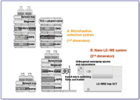 Figure 1. A two-dimensional LC-MS instrument system. Both on- and off-line configurations comprise a nanoflow pump with a micro vacuum degasser; thermostatted micro well-plate autosampler; two-position/six-port micro switching valve box with holder; SCX ion-exchange column (first-dimension); RPLC analytical and enrichment nanocolumns (second-dimension) with matching low dead volume tubing, fitting, and holdings; a quarternary pump and LC-MSD Trap XCT with an orthogonal nanospray source. Off-line configuration (shown here): An Agilent 1100 Series Micro-Fraction Collection System comprising a capillary pump with a micro vacuum degasser, thermostatted well-plate autosampler, thermostatted column compartment with a micro two-position/six-port micro valve, diode-array detector with 500 nL cell, and thermostatted microfraction collector is interposed between the SCX and RPLC separation dimensions.