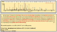 Figure 5. MS-MS spectrum of one identified peptide from phosphopyruvate hydratase. The specific peptide sequence, as well as the total sequence coverage and the database accession number of the identified protein, is shown below the spectrum.