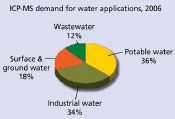 Demand for ICP-MS from water applications was well over $60 million in 2006, which accounts for more than a quarter of the entire ICP-MS market and represents about 4% of the combined laboratory and process water analysis instrumentation market. The two largest areas of application in the water market for ICP-MS are industrial process water and potable water, which account for roughly 70% of this market segment combined. Tighter regulations, such as for arsenic in drinking water, and the increasing need for sensitivity to water contaminants in industries such as semiconductors, are two prime examples of areas in which the improved performance of ICP-MS is needed. Annual growth of the market for ICP-MS in water analysis should be similar to that of ICP-MS in general, at 7% to 8%.