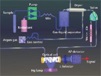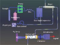 While simple, manual systems like that described by Hatch and Ott are still available today, most modern CVAAS instruments are more sensitive, automated, smaller, faster, and less expensive than generic flame spectrometers with cold vapor devices attached. Today's CVAAS systems provide detection limits of just a few parts per trillion, analyze samples in about 1 min, require very little operator interaction, and take up just a couple of square feet of bench space. Figure 1 provides an overview of a cold vapor atomic absorption system. With CVAAS instruments a peristaltic pump is typically used to introduce sample and stannous chloride into a gas–liquid separator where a stream of pure, dry gas is bubbled through the mixture to release mercury vapor. The mercury is then transported via carrier gas through a dryer and then into an atomic absorption cell. Mercury absorbs 254-nm light in proportion to its concentration in the sample.