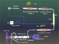 Figure 3 shows an overview of the direct analysis technique. With this approach, a weighed sample is introduced into the decomposition furnace with oxygen (or air) flowing over the sample. The furnace temperature is ramped in two stages; first to dry the sample and then to decompose it. As the evolved gases are released, they are carried into a catalyst where further decomposition occurs and elemental mercury is released. When the gas stream leaves the catalyst elemental mercury is captured on the surfaces of a gold amalgamation trap. After the sample's mercury has been collected, the gold trap is heated and the accumulated mercury proceeds to an atomic absorption detector for quantitation.