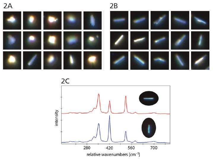 In the WS2 sample 3,135 nanoparticles were detected and imaged (Figure 2). From these, 218 were classified as nanowires according to their aspect ratios. The Raman peak at 420 relative wavenumbers (cm-1) indicates the orientation of the nanowires with respect to the polarization of the laser light.