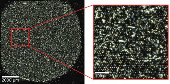Figure 1: A 10 × 10 mm2 dark-field overview of a filter with microparticles from sludge was stitched together from 1089 images (left). From the selected area (right), Raman spectra were acquired from 18,000 fragments. The particles were automatically located and measured using the ParticleScout software.