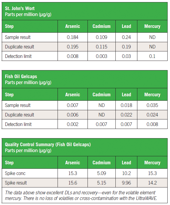 Two sample types, St. John's wort and fish oil, typical of finished product pharmaceuticals, were digested using an SRC digestion system and analyzed for the four toxic USP elements using collision-cell ICP-MS. Since all samples are digested together in a single chamber, duplicates and spike recoveries were performed to confirm the retention of volatile elements and the absence of cross contamination.