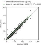 Figure 1: Ammonia concentrations compared measurements with the original DOAS and with the miniDOAS agree excellently. The plot is based on 13,903 live minute values.