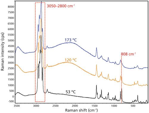 Figure 2: Raman spectra for polypropylene at 53 °C (black), 120 °C (yellow), and 173 °C (blue). The dashed line at 808 cm-1 and dashed box from 3050 cm-1 to 2800 cm-1 indicate relevant Raman bands to the recrystallization of polypropylene.