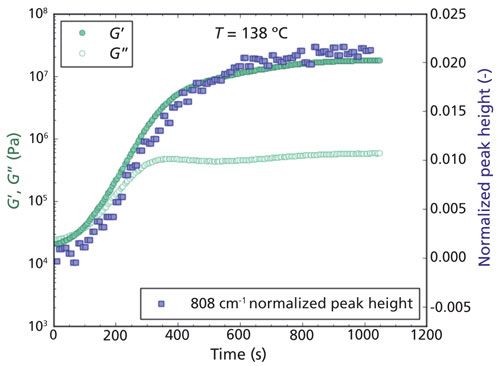 Figure 4: Polypropylene isothermal recrystallization at 138 °C: G’ and G” (filled and open circles, respectively; plotted on the left y-axis) and the 808 cm-1 Raman shift peak height (filled squares; plotted on the right y-axis) as a function of time.