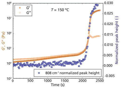 Figure 5: Polypropylene isothermal recrystallization at 150 °C: G’ and G” (filled and open circles, respectively; plotted on the left y-axis) and the 808 cm-1 Raman shift peak height (filled squares; plotted on the right y-axis) as a function of time.