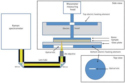 Rheological measurements are used to study the bulk physical and mechanical properties of complex fluids and soft matter. Conversely, vibrational spectroscopy (like Raman) is a noninvasive diagnostic tool that provides chemical information such as chemical composition, molecular conformation, and bond disruption and formation-to name a few. Most commonly, these two analytical techniques are used ex situ, where rheology is used to measure or induce a physical material change (for example, melting, crystallization, gelation, polymerization, and chemical crosslinking) and chemical analysis is typically performed before and after the observed physical transformation. When applying these two techniques ex situ, however, the underlying chemical changes that are driving the observed physical change are left uncaptured, forcing researchers to speculate on the dynamic physicochemical relationships of their materials. In a recent paper, Kotula and colleagues (1) demonstrated the benefits of coupling a Raman microscope to a rheometer in studies of the recrystallization of high-density polyethylene.
