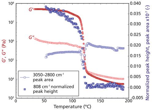 Figure 3: Polypropylene recrystallization: G’ and G” (filled and open circles, respectively; plotted on the left y-axis) and the 808 cm-1 Raman shift peak height and the 3050–2800 cm-1 peak area (filled and open squares, respectively; plotted on the right y-axis) as a function of decreasing temperature from 190 °C to 30 °C.