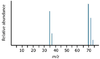 The Cl.+ ions pass through the instrument and give lines at 35 and 37, depending on the isotope, and would produce exactly the pattern as in the last diagram. The problem is that you will also record lines for the unfragmented Cl2.+ ions.