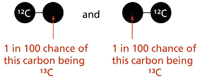What happens when there is more than one carbon atom in the compound?: Imagine a compound containing two carbon atoms. Either of them has an approximately 1-in-100 chance of being 13C (Figure 3). So a 2-in-100 chance exists for the molecule as a whole to contain one 13C atom rather than a 12C atom, which leaves a 98-in-100 chance of both atoms being 12C. The corresponding ratio of the height of the M+1 peak to the M peak is therefore 2:98, which gives an M+1 peak of approximately 2% the height of the M peak.