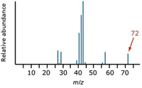 Figure 1: Simplified mass spectrum of pentane. The largest m/z value, 72, represents the largest ion going through the mass spectrometer.