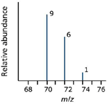 Thus a set of lines in the m/z 70 region would look like the spectrum shown in Figure 6. The relative heights of the 70, 72, and 74 lines are in the ratio 9:6:1.