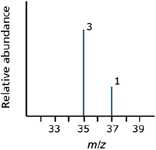 The mass spectrum of chlorine: Chlorine has two isotopes, 35Cl and 37Cl, in the approximate ratio of three atoms of 35Cl to one atom of 37Cl. If the rules presented so far hold true, the mass spectrum would look like the one shown in Figure 5.