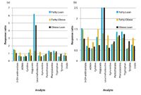 Rat Plasma Metabolomics: Plasma samples from lean (n = 10), fatty (n = 9) and obese (n = 10) Zucker rats were analyzed by LC–MS using high-performance TOF-MS. The analysis of the data was achieved by means of two mechanisms. In one, a list of established analytes was used to search the data for these analytes using an accurate mass targeted approach. In these instances, the exact m/z value was searched against the existing data to within 0.001 m/z unit. In the other, the accurate m/z values obtained from the analyses were used to determine molecular formulas, and the formulas or the accurate m/z values were searched in ChemSpider (17) or KEGG (18) or other similar metabolite databases to facilitate the identification of the analyte in question. In both of these instances, the ratio of area responses in the samples from the different phenotypes were then averaged and compared to each other for differences as three ratios. Specifically, the Lean:Fatty, Lean:Obese, and Fatty:Obese response ratios were generated, and the averages for each phenotype are provided graphically in Figure 3 for representative analytes. The plot shows several selected or readily identified analytes that show positive changes in the Lean:Fatty and Lean:Obese ratios relative to the Fatty:Obese ratio. These include leucine/isoleucine, hippurate, dimethylarginine, kynurenine, and urate. The nearly sixfold change in leucine/isoleucine is the most striking and largest proportional positive change for the "fatty" phenotype, while the change in kynurenine is the highest magnitude change negatively correlated with the "fatty" state. Both kynurenine and leucine/isoleucine have been previously associated with diabetes and obesity (19–23).