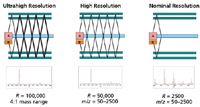 However, these approaches are limited by dispersions and higher order aberrations, as well as flight lengths on the order of a few meters. Other efforts have attempted to extend the flight path using cyclotron and torroidal analyzers (13). Duty cycle and effective mass range are typical compromises to high levels of mass measurement performance. With these advances, TOF has achieved a position in the realm of mass analyzers in which it provides sensitivity, mass accuracy and resolution that surpass some magnetic sector systems and encroach on the analyses historically reserved for FTMS systems. The principle advantage of a TOF system is the absence of scanning. This provides a mass measurement system well suited to analyte surveys rich in information content and high in duty cycle. These advances have opened the world of high resolution accurate mass analysis, historically the domain of FTMS and magnetic sectors, to TOF mass analyzers with the added benefit of simplicity and speed. The significant advances of TOF mass analyzers toward high-performance mass spectrometers continue in the approach discussed below.