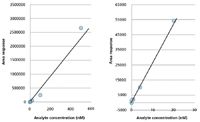 Of additional importance in metabolomic analysis is the dynamic range of the instrument. To effectively interrogate both abundant and trace level analytes simultaneously, the linearity of response across several orders of magnitude is necessary. To explore this and the limit of detection of the accurate mass system, a standard curve of butyryl carnitine was created that covered the range of 0.16 through >500 nM. The plots of response versus concentration are shown in Figure 6 (Figure 6a: 0.16–500 nM; Figure 6b: 0.16–20 nM) and demonstrate that the dynamic range achievable here is clearly in excess of the 500 nM point shown (2500 nM not shown). This is equivalent to a linear dynamic range greater than 3000-fold (15,000-fold at 2500 nM). The experiment has its lowest detectable level at 0.16 nM or approximately 200 fg of butyrylcarnitine on-column. This translates to the ability to examine either dramatic differences in concentrations of a single analyte or a range of analytes at substantially different concentrations in the same analysis.