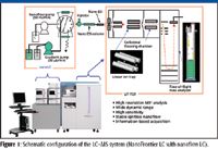 The LC system for the MS system can either be a semimicro flow LC or a nanoflow LC (nanoLC) system, depending upon application. The nanoflow LC system is uniquely suited to the quantitative analysis of proteins because of its accurate reproducibility in chromatographic retention time for trace samples. It is capable of gradient flow at 50–250 nL/min rates with high stability and high reproducibility even at 50 nL/min, which is achieved by a splitless gradient mechanism called dual exchange gradient system (DEGS) (19,20).
