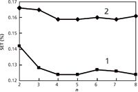 Figure 3: Relative curves between SET and triethylamine (plot 1) and dimethylaniline (plot 2) wavelet decomposition level in the WDPDS algorithm.