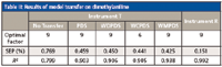 NIR spectra of prediction samples measured from the target instrument T were calibrated by the PDS algorithm, the WDPDS algorithm, the WCPDS algorithm, and the WMPDS algorithm, respectively. Values of prediction samples were achieved through the analysis of all these calibrated spectra, using the PLS model developed from the reference instrument R. The results and parameters in each case are shown in Tables I and II.