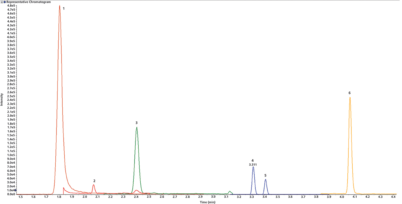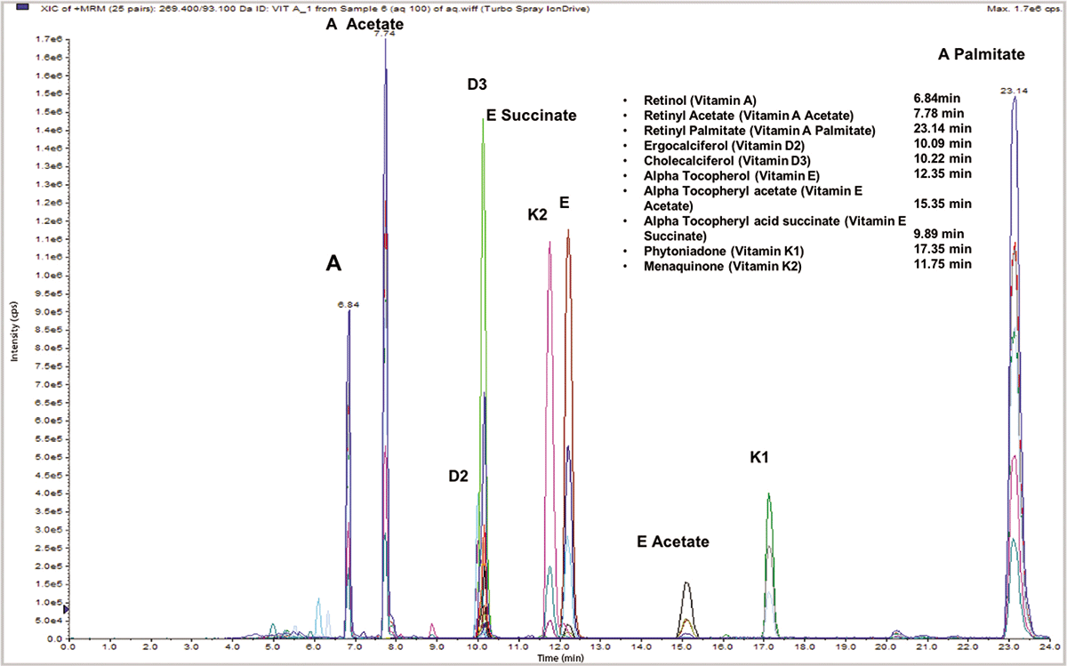 The detection of vitamins provides a specific detection challenge and, until recently, it was difficult to detect fat-soluble vitamins using LC–MS methods. Food samples contain various concentrations of vitamins, ranging from parts per billion to parts per million. To obtain clean, analyzable detection of fat-soluble vitamins, the lipid content should be removed from food samples. This reduces the ion suppression, and enables robust MS analysis within a single chromatogram that identifies multiple vitamins (see Figure 3). Combining sensitive MS methods with associated expertise in methodology allows universal application of the sample preparation and a simple analysis of vitamin concentrations in various food samples, meeting the specific requirements of the customer.