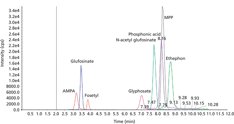 The controversy surrounding the use and potential contamination of glyphosate has placed greater emphasis on data collection and analysis methods to ensure levels of glyphosate in food samples fall below the safe maximum residue level (MRL) (reported by the EFSA as 50 µg/kg) (10). However, while the analysis of glyphosate and its associated metabolites is essential, its detection presents different sample preparation and analysis challenges that must be overcome. The high polarity of glyphosate and its related metabolites previously made sample extraction and LC analysis difficult. To overcome retention issues, derivatization is employed using a method with fluorenylmethyloxycarbonyl chloride (FMOC-Cl) as the derivatization reagent to convert glyphosate into an analogue that can then be analyzed. However, while this approach enables detection, it is both complicated and time-consuming, and fails to detect pure glyphosate and its metabolites.