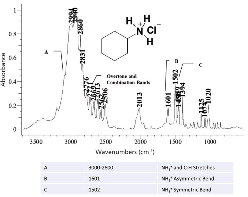 A primary amine salt features the NH3+ unit, with the resultant broad intense NH+ stretching envelope seen in Figure 3. For primary amine salts, generally this envelope falls from 3200 to 2800. We already know that alkane C-H stretches also fall in this region (9). As is common in IR spectroscopy (10), if a broad peak and a narrow peak fall in the same wavenumber range, the narrow peak may be seen on top of or as a shoulder on the broader peak. This is why the CH2 stretches of the cyclohexyl group sit on top of the NH+ stretching envelope. As already mentioned, there is a series of overtone and combination bands on the right hand side of the NH3+ stretching envelope. These features are common for all amine salt spectra, and the fall in the range from 2800 to 2000. Recall that carboxylic acids have a similar series of overtone and combination bands in this region, also caused by the extreme polarity of this functional group (11).