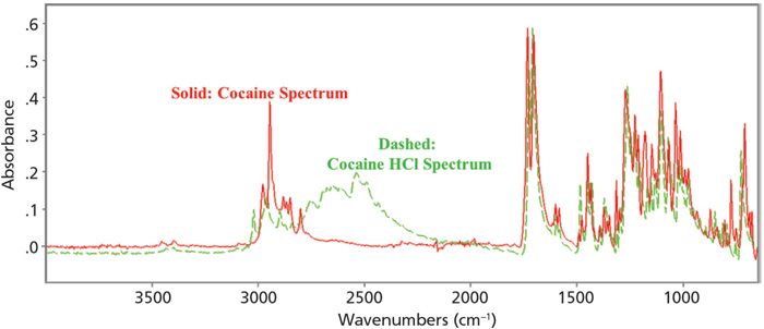 Being able to distinguish amines from amine salts even has legal implications. Cocaine is found in two forms, the hydrochloride amine salt and the amine or "free base" with the street name crack cocaine (7). In the United States, possession of these two illicit substances carries different penalties, as the crack version is considered more dangerous. One of the major uses of Fourier transform infrared spectroscopy (FT-IR) in forensic labs is distinguishing cocaine hydrochloride from cocaine. Fortunately, this is easy as can be seen in Figure 2, which shows an overlay of the IR spectra of cocaine base and cocaine HCl.