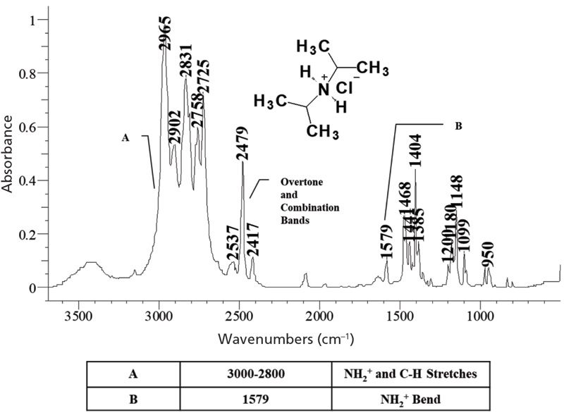 Secondary amine salts contain the NH2+ group. The IR spectrum of a secondary amine salt, diisopropylamine hydrochloride, is seen in Figure 5.