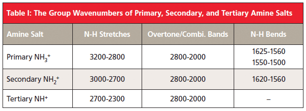Table I lists the N-H stretching envelope positions for the three different types of amine salts. Note that there is some overlap, particularly between primary and secondary amines.