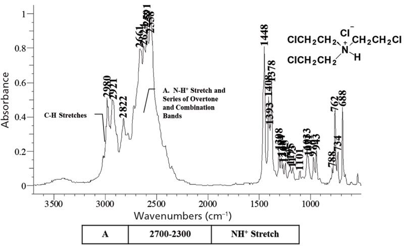 The amine salt functional group contains ionic bonding, and is extremely polar, giving rise to a number of intense and uniquely placed peaks that are easy to identify for primary, secondary, and ter tiary amines.