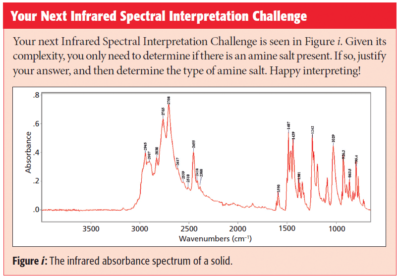 We discussed previously that tertiary amines have no strong, unique peaks, and thus are difficult to detect using IR spectroscopy (12). This contrasts with tertiary amine salts, whose NH+ stretching envelope sticks out like a sore thumb. A way of detecting a tertiary amine in a sample then is to treat 1 mL of liquid tertiary amine, or tertiary amine dissolved in an organic solvent, with 1 mL of 50:50 HCl in ethanol. If there is a tertiary amine present, the amine salt will form and precipitate as a solid from solution (12). Collect the precipitate via filtration, dry, and measure its IR spectrum. If you see a big, whopping NH+ stretching envelope like the one seen in Figure 6, your original sample contained a tertiary amine.