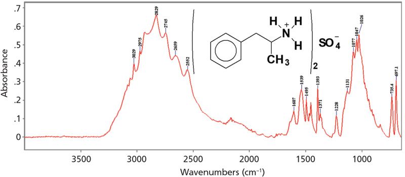 A note on the spectra of anions in amine salts: For hydrochloride salts, where the anion is the chloride or Cl– ion, due to its mass, peaks from vibrations involving this ion generally fall below 400, where most FT-IR spectra cut off. However, amine salts made from acids with polyatomic anions, such as sulfuric acid, do exhibit anion peaks in the mid-IR region. This is illustrated by the spectrum of d-amphetamine sulfate, which is made by reacting amphetamine with sulfuric acid, and whose spectrum is seen in Figure 4.